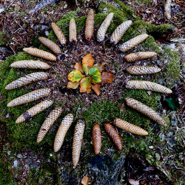 In der Natur können wir zur Ruhe kommen, denn die Zeit scheint still zu stehen. Die spielerische Auseinandersetzung mit den vorgefundenen Naturmaterialien weckt alle unsere Sinne und zieht uns in ihren Bann. Es ist sodann der Entstehungsprozess, der fasziniert und voranbringt. Und auf einmal steht nicht mehr das Material im Vordergrund, sondern das Geheimnisvolle des künstlerischen Schaffens.